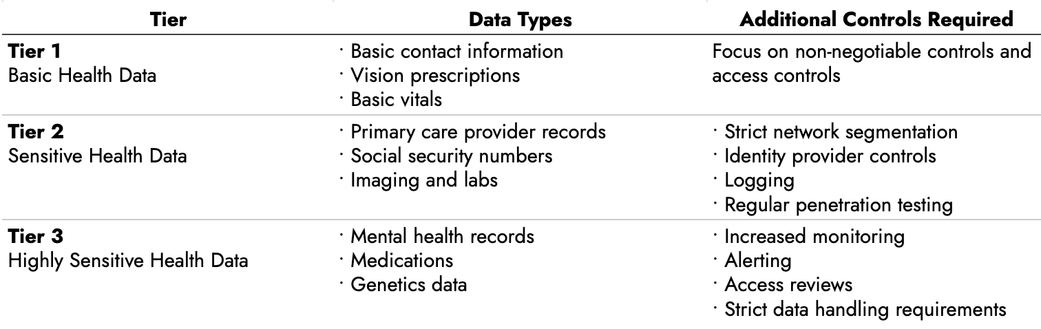 For example, your primary care provider records, social security numbers, imaging and labs. Now, you add more technical restrictions with strict network segmentation, identity provider controls, logging, and regular penetration testing.