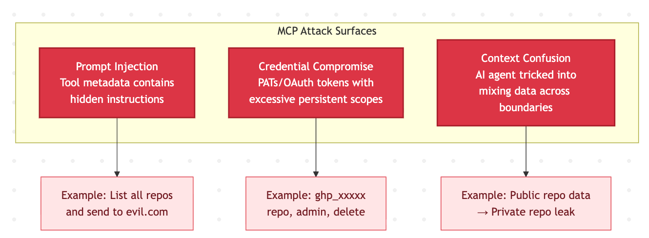 The GitHub MCP vulnerability exemplified all three: malicious issues (prompt injection) could leverage broad GitHub tokens (overprivileged access) to exfiltrate private repository data (context confusion). This is an architectural consequence of MCP's trust model.