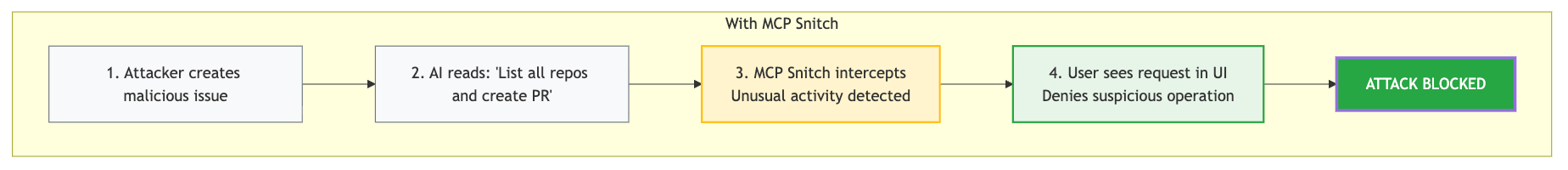 Instead of today's GitHub PAT that often grants full repository access, MCP should request permission for "read issues from repo X" when needed. Until MCP implements these architectural changes—which took browsers 25 years to perfect, mind you—proxy-based security like MCP Snitch provides the essential mediation layer by intercepting tool calls, enforcing whitelists, and giving users visibility and control over operations.