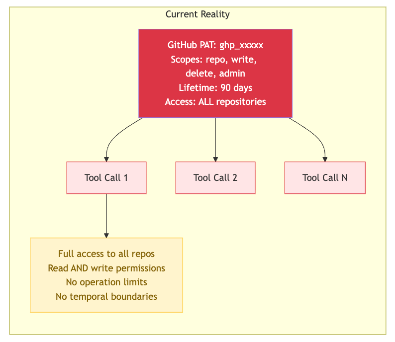 When you create a GitHub Personal Access Token for MCP, you're forced to grant permissions at the repository or organization level. Want to read issues from one repo? Your token must have "repo" scope, granting read/write access to all repositories, including private code, secrets, and deployment keys. This isn't unique to GitHub as most API providers follow this pattern.
