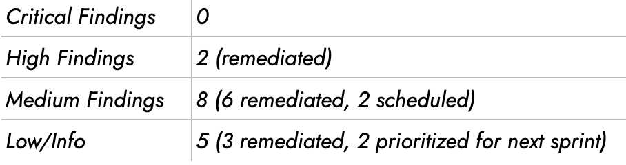 All critical and high-severity findings identified in our independent security assessment have been remediated and retested. This validates that our security investments are working as designed.