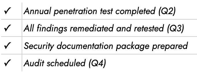 - “We completed our annual penetration test in Q2, remediated all findings, and are now prepared for our Q3 audit”
